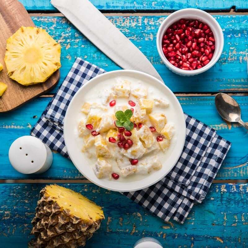 In a bowl combine the fruit and lemon juice. In a salad bowl whisk together the yogurt sour cream cumin paprika and garlic. Fruit raita is a best way to include vitamins and proteins.